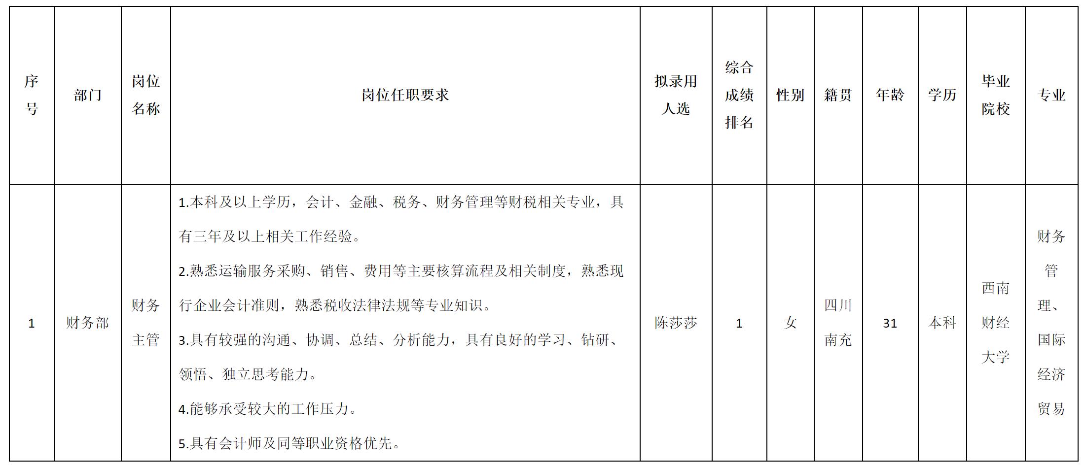 根據四川長虹民生物流股份有限公司發布的招聘公告及招聘相關規定,經面試、考察、體檢等程序,擬錄用陳莎莎同志到四川長虹民生物流股份有限公司工作,現予以公示,具體情況如下