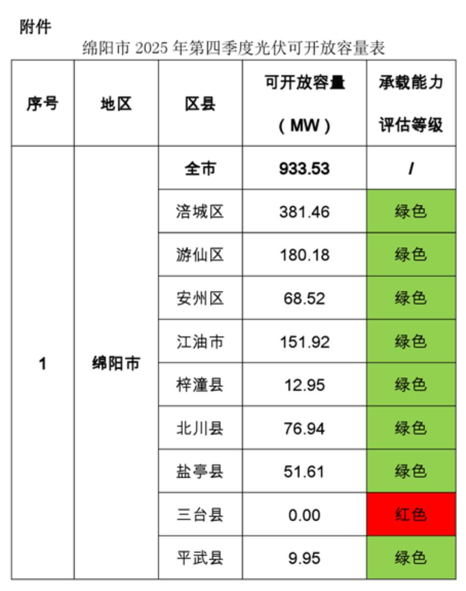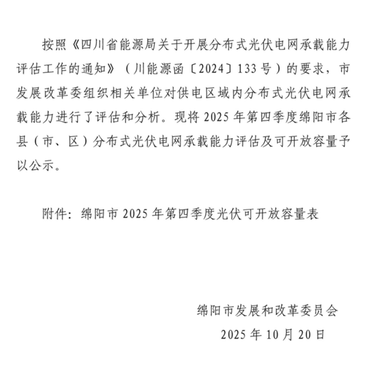 綿陽市發展和改革委員會關于對2025年第四季度分布式光伏電網承載能力評估及可開放容量的公示