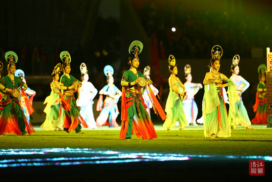 緊接著,體現(xiàn)綿陽(yáng)和廣元?dú)v史文化元素的大型古風(fēng)融合秀《郪風(fēng)唐韻》唯美來(lái)襲。380余名表演者隨歌而舞,衣袂翩躚,伴隨著大型立鼓敲響,2只飛天鳳凰繞場(chǎng)飛翔助陣將現(xiàn)場(chǎng)氣氛推向了高潮。
