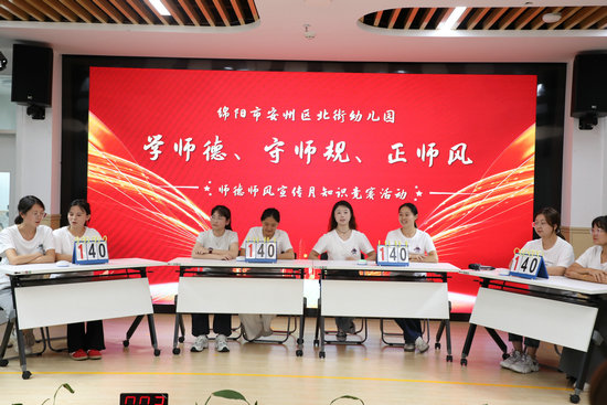 本次競賽分為兩部分,一是全園教師筆試,采用閉卷、單人獨立答題形式,真實檢驗個人學習情況,內容緊扣師德師風建設宣傳月學習重點。二是現場知識競賽。各年級組結合前期學習情況和筆試環節得分綜合選拔出2 人組隊,全園共4支隊伍參賽。