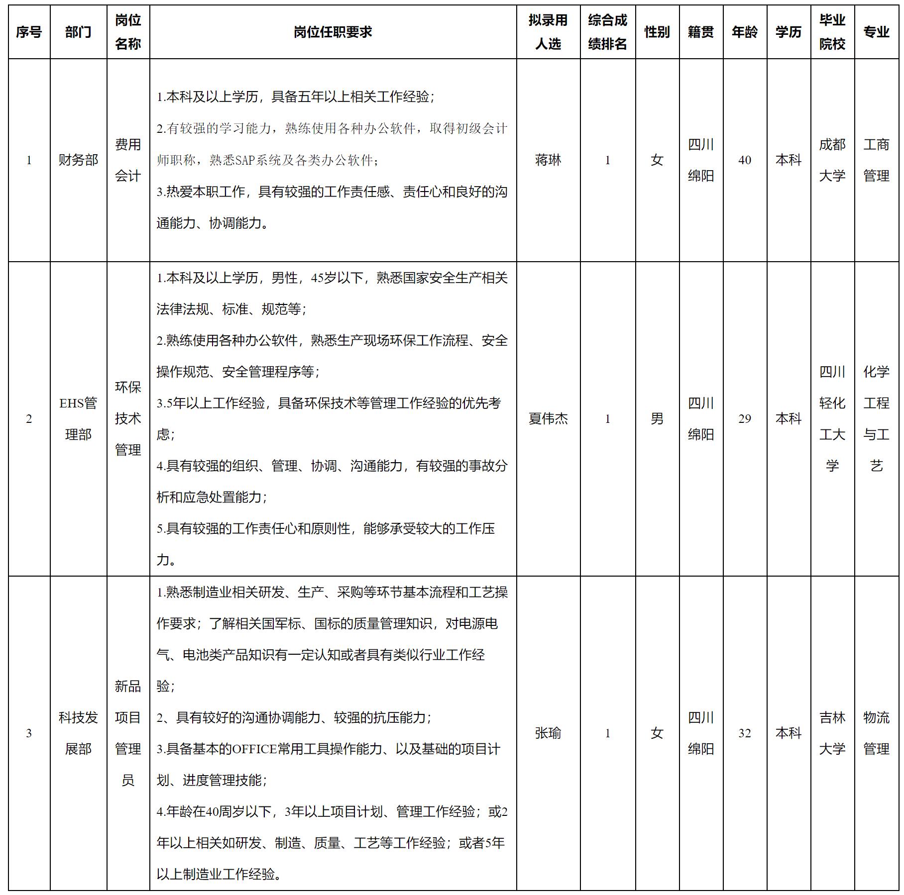 根據四川長虹電源股份有限公司發布的招聘公告及招聘相關規定,經測試、考察、體檢等程序,擬錄用蔣琳、夏偉杰、張瑜同志到我司工作,現予以公示,具體情況如下: