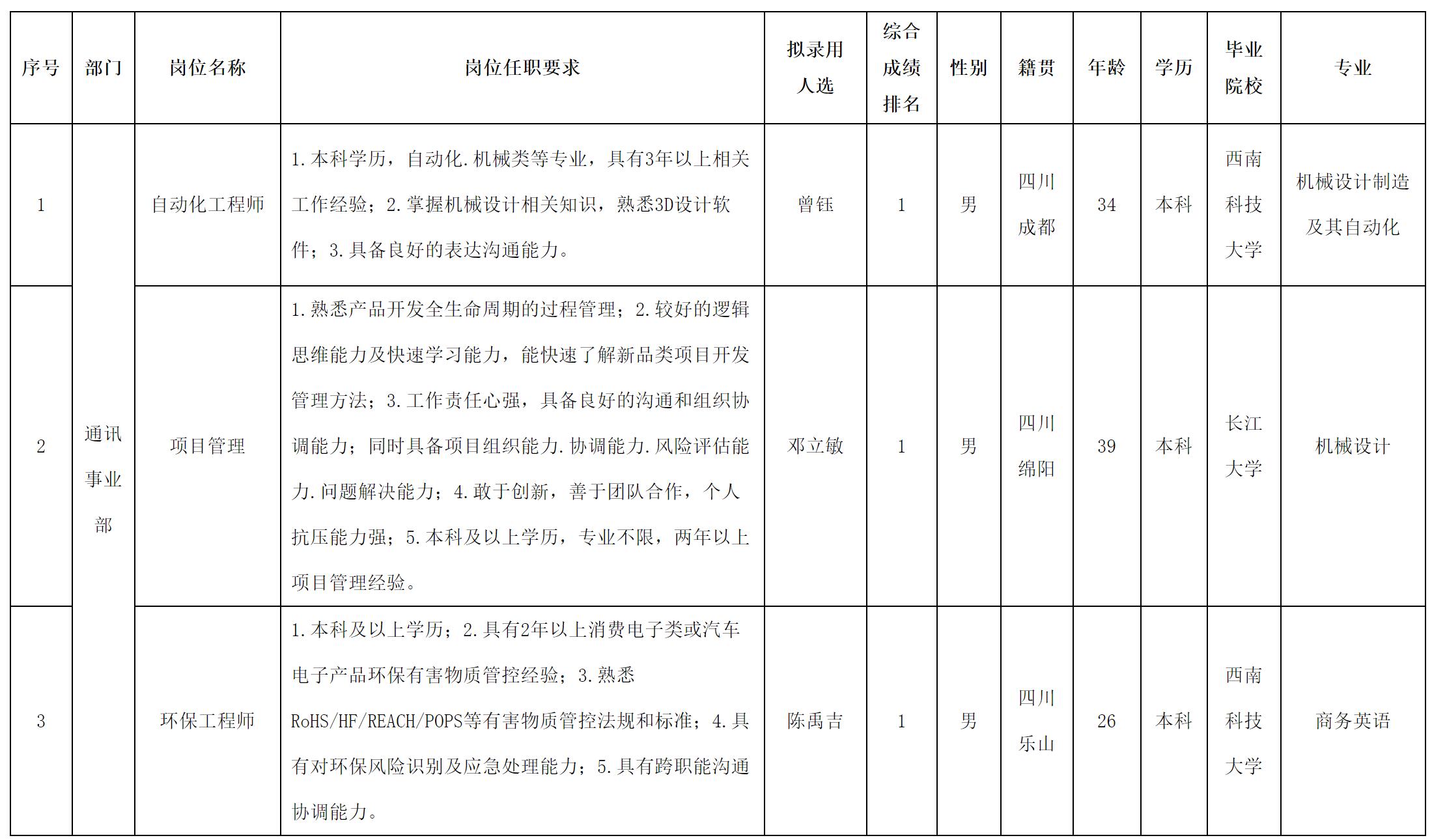 根據四川華豐科技股份有限公司發布的招聘公告及招聘相關規定,經測試等程序,擬錄用曾鈺等同志到四川華豐科技股份有限公司工作,現予以公示,具體情況如下: