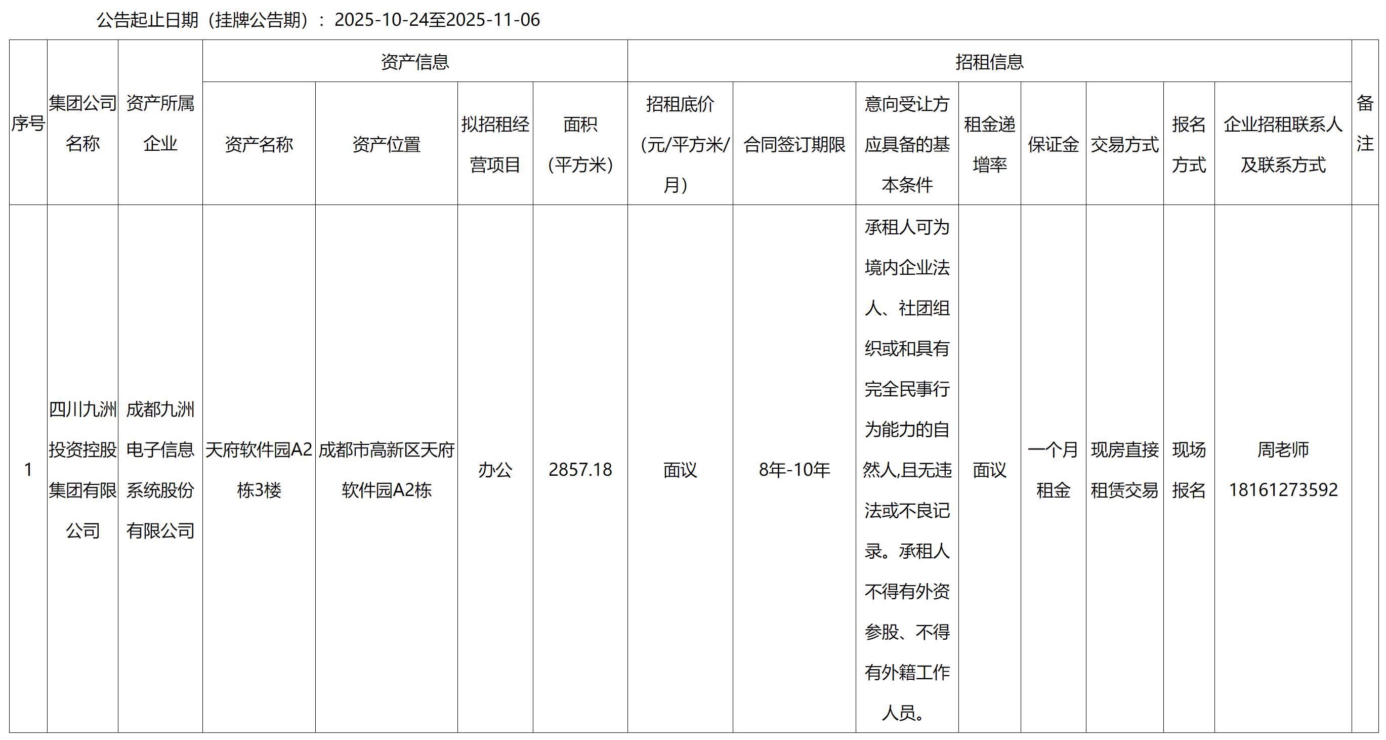 成都九洲電子信息系統股份有限公司資產出租公告