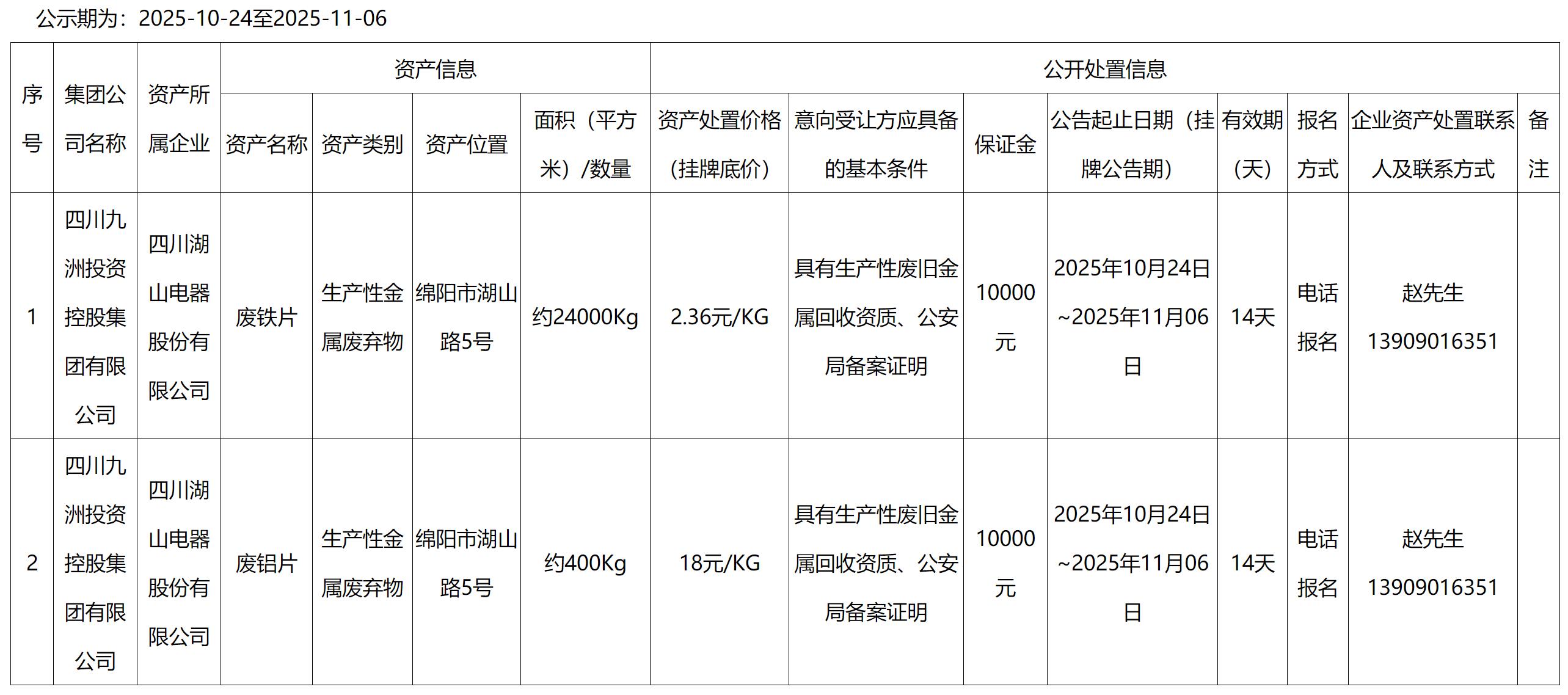 四川湖山電器股份有限公司生產性廢棄物周期性處置公告