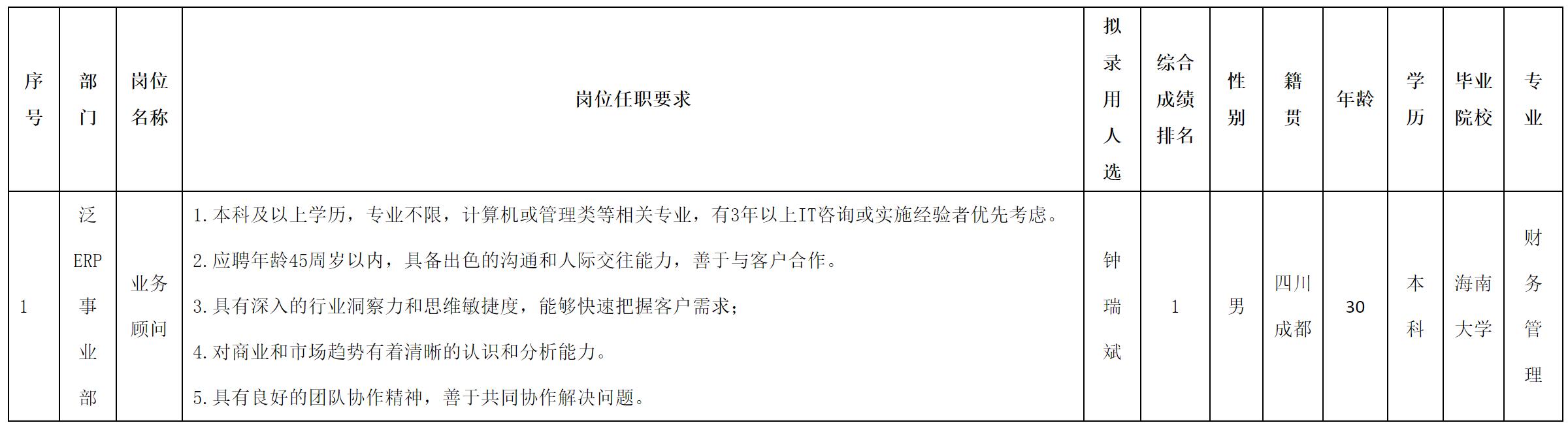 根據四川虹信軟件股份有限公司發布的招聘公告及招聘相關規定,經測試、考察、體檢等程序,擬錄用鐘瑞斌同志到四川虹信軟件股份有限公司工作,現予以公示,具體情況如下: