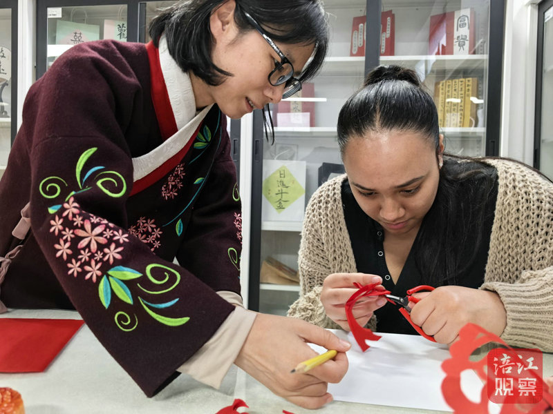剪紙區(qū)里,非遺老師手握剪刀,寥寥數(shù)下便將一張彩紙變成靈動月餅形狀的窗花,留學(xué)生們在老師的教授下,指尖雖略顯生疏,但最終剪出了想要的圖案。新西蘭留學(xué)生特-拉哈納·佩塔·羅皮哈拿著自己的作品歡呼,興奮地向其他留學(xué)生“炫耀”。他興奮地說:“太神奇了!像魔術(shù)一樣!”