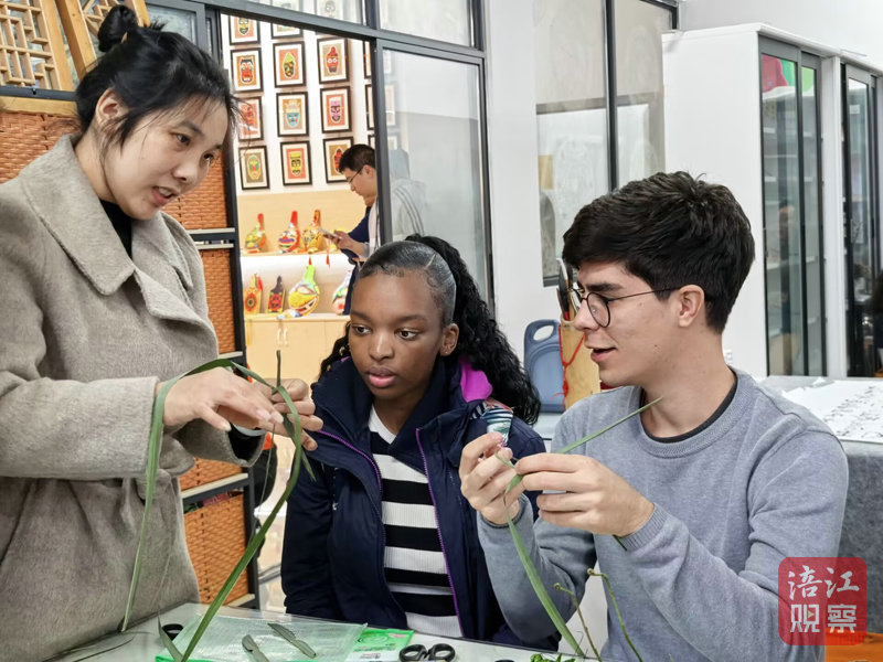 在草編區(qū),非遺傳承人黎覓現(xiàn)場展示技藝,一根根普通草絲在指尖纏繞、打結(jié),秒變惟妙惟肖小動物,留學(xué)生們爭相討教,學(xué)得有模有樣。