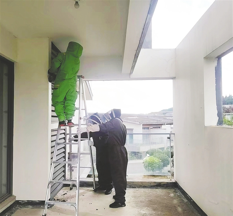 為保障安全,劉康寧身著專業防蜂服,使用密封捕蜂箱等工具,迅速而穩妥地將蜂巢完整清除,并對周邊區域進行驅蟲處理,防止蜂群返回。