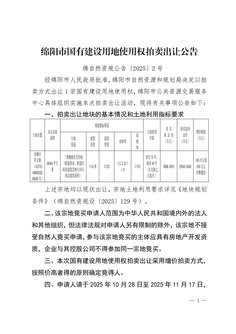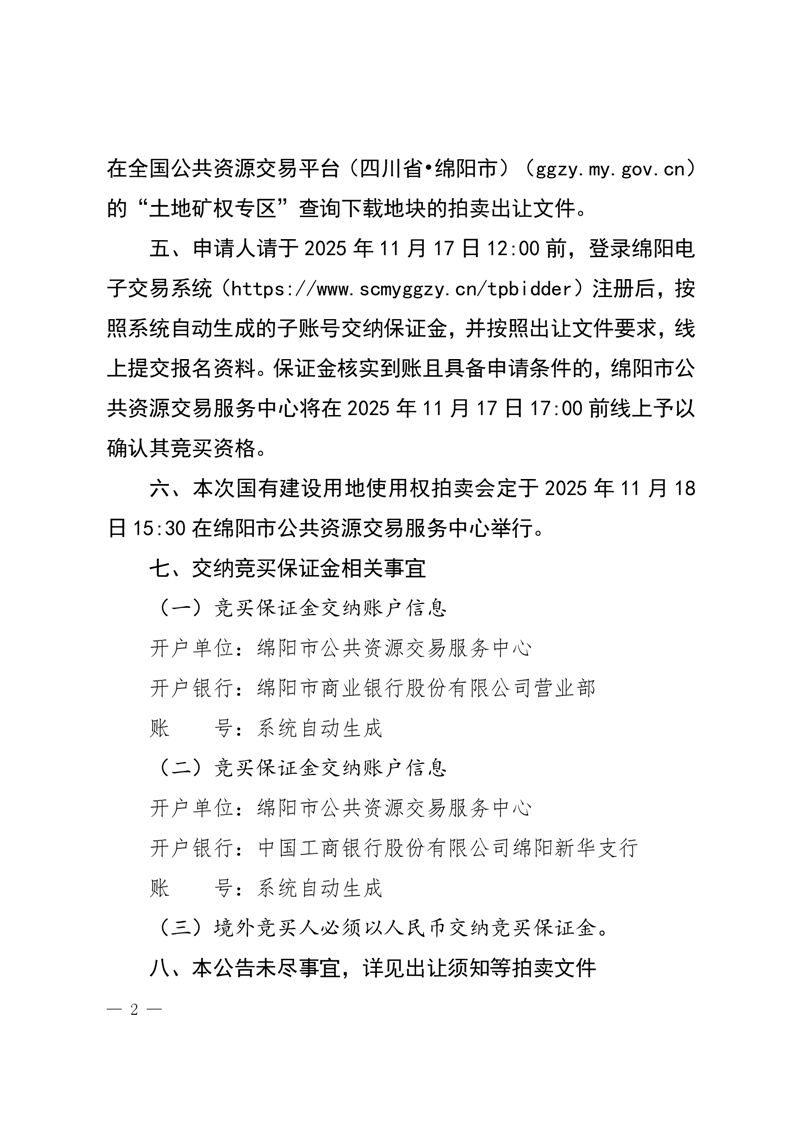 綿陽市國有建設用地使用權拍賣出讓公告(綿自然資規公告〔2025〕2號)