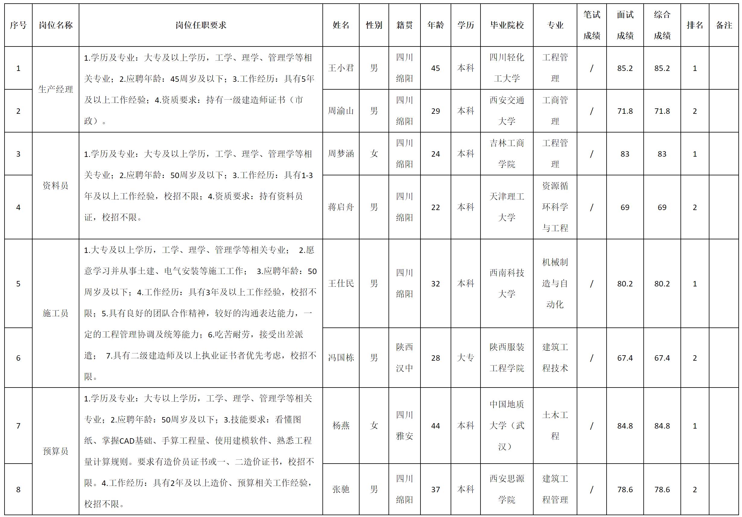 根據四川九洲建筑工程有限責任公司發布的招聘公告及招聘相關規定,現將測試成績予以公示。