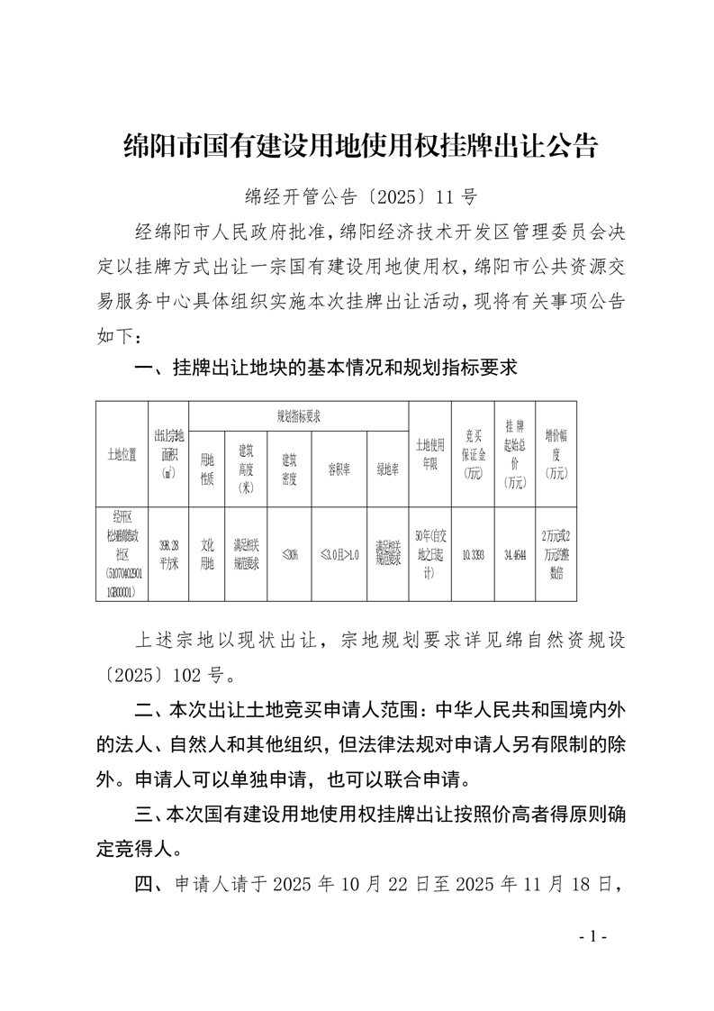 綿陽(yáng)市國(guó)有建設(shè)用地使用權(quán)掛牌出讓公告(綿經(jīng)開(kāi)管公告〔2025〕11號(hào))