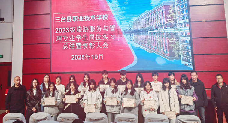 綿陽新聞網訊 為了全面總結2025年度實踐教學工作經驗,表彰先進,樹立典型,激勵全體學生崇尚技能、砥礪前行,10月23日,三臺縣職業技術學校招就處在學校第一學術廳舉行了以“錘煉技能展風采,砥礪前行啟新篇”為主題的2023級旅游服務與管理專業實習總結暨表彰大會。三臺縣職業技術學校黨委成員、副校長趙娜,學旅部、招生就業處相關負責人,實習管理指導教師及全體實習學生、各年級學生代表共計150人共同參會。