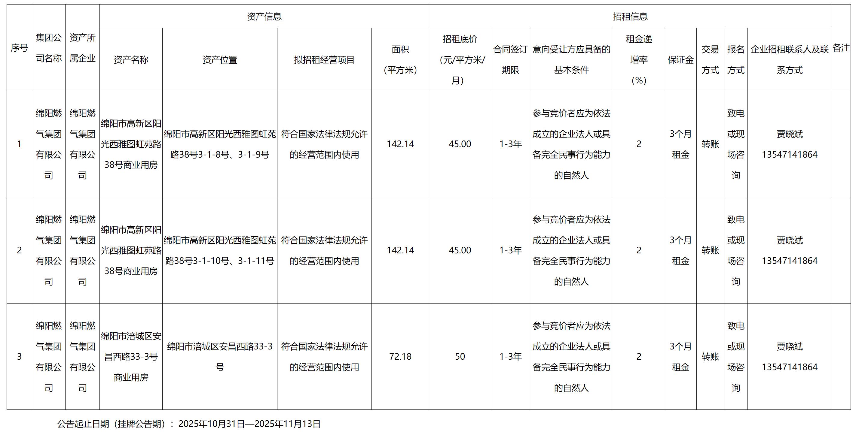 綿陽燃氣集團有限公司資產出租公告