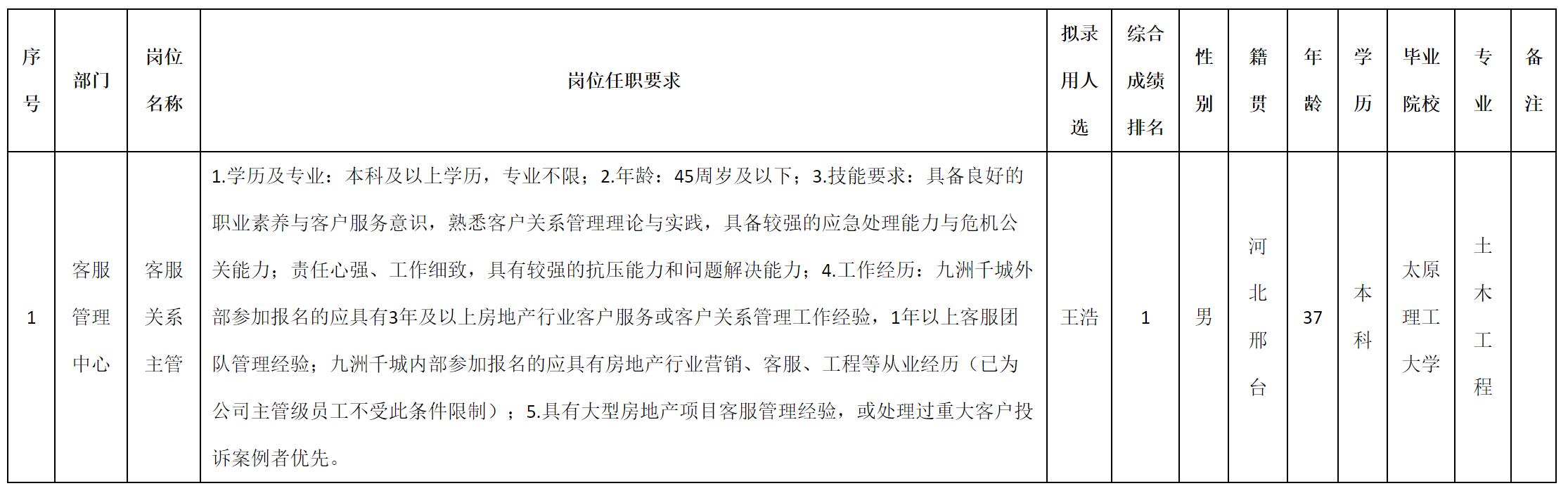 根據九洲千城置業有限責任公司發布的招聘公告及招聘相關規定,經測試、考察、體檢等程序,擬錄用王浩同志到九洲千城置業有限責任公司工作,現予以公示,具體情況如下: