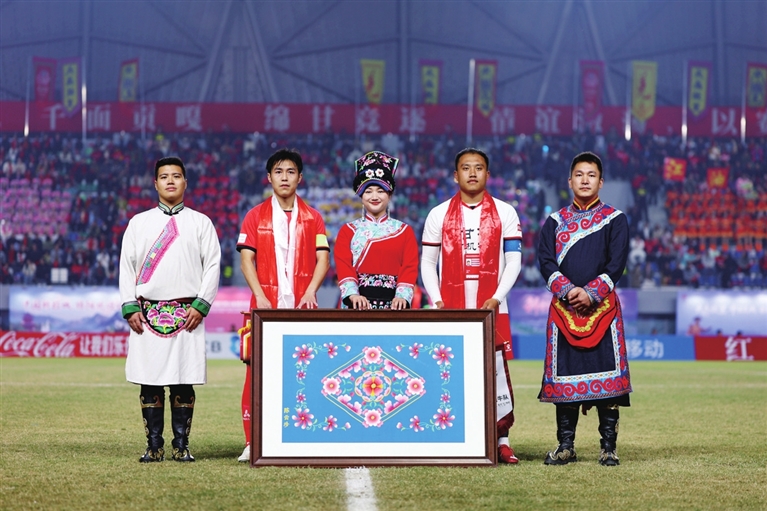 綿陽新聞網(wǎng)訊 11月1日19時30分,在綿陽九洲長虹隊與甘孜有機牦牛隊的比賽開場前,黨的二十大代表、國家級非遺代表性項目羌繡省級代表性傳承人陳云珍耗時2個月繡制的《羊角花開 情意綿長》作品,由她的女兒楊紅莉贈送給甘孜隊。