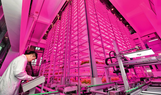 在位于四川天府新區(qū)的中國農(nóng)業(yè)科學(xué)院都市農(nóng)業(yè)研究所超高層無人化垂直植物工廠內(nèi),科技人員在調(diào)試軟件(2024年10月16日攝)劉坤攝/本刊