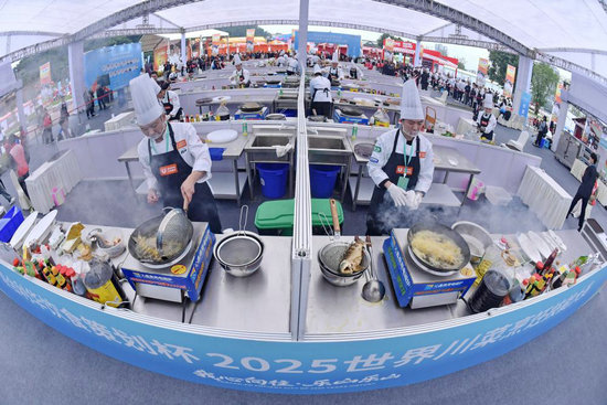 11月1日,第八屆世界川菜大會在四川樂山舉行。廚師在2025世界川菜烹飪技能大賽比賽中。新華社發(李向雨攝)