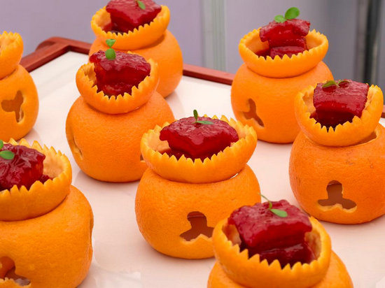 11月1日,第八屆世界川菜大會在四川樂山舉行。在2025世界川菜烹飪技能大賽現場,“橙香方肉”新鮮出爐。新華社記者邊思琪 攝