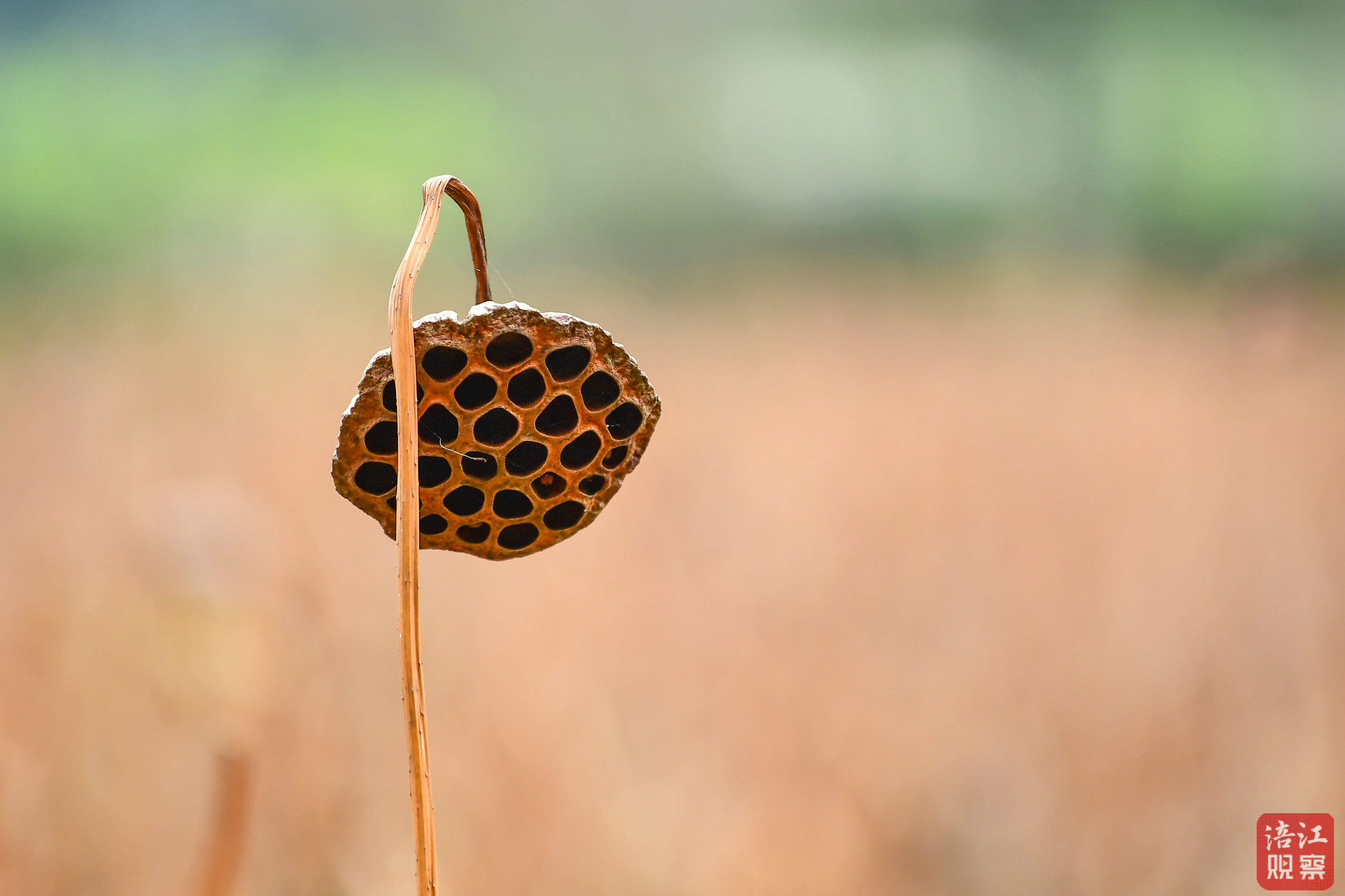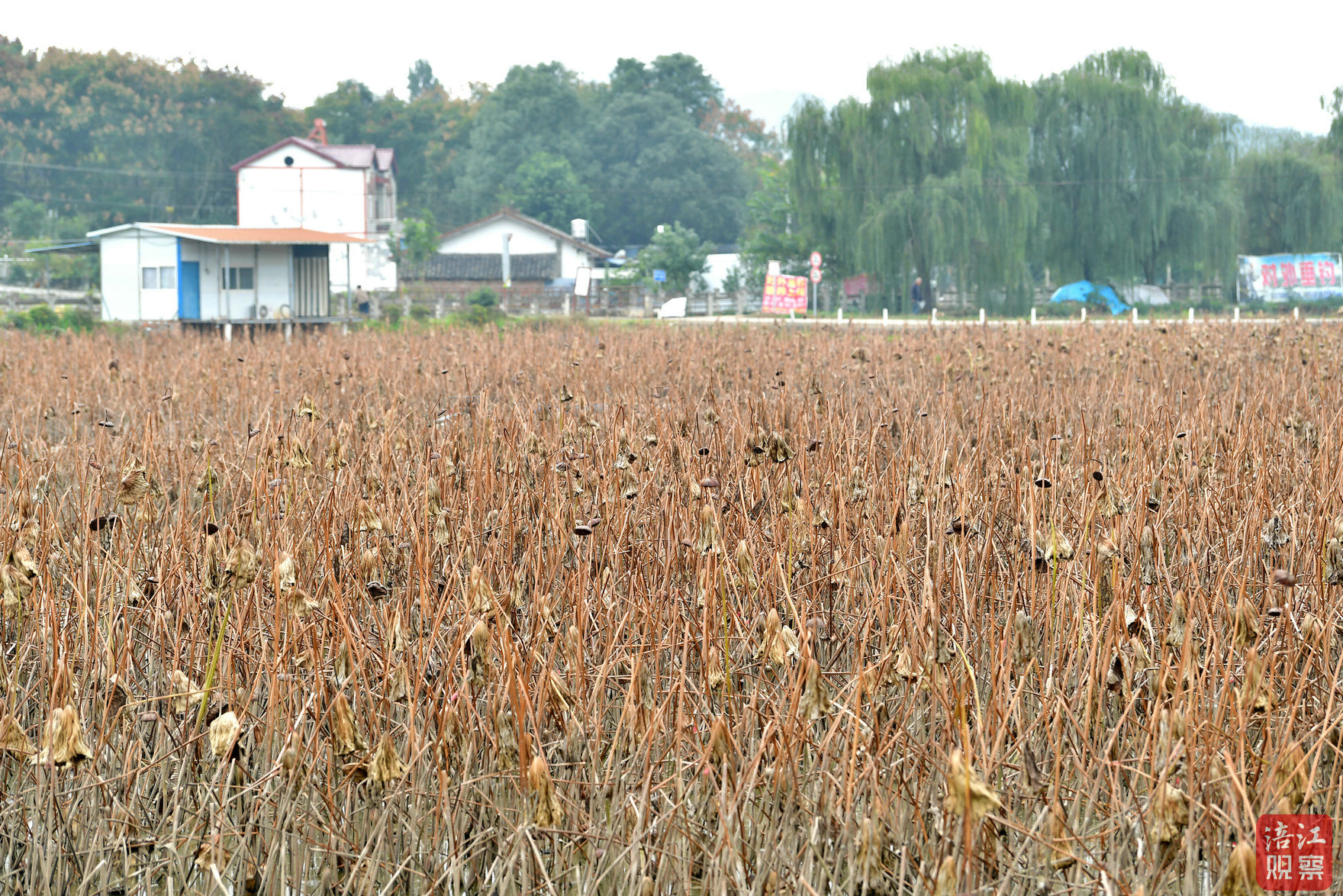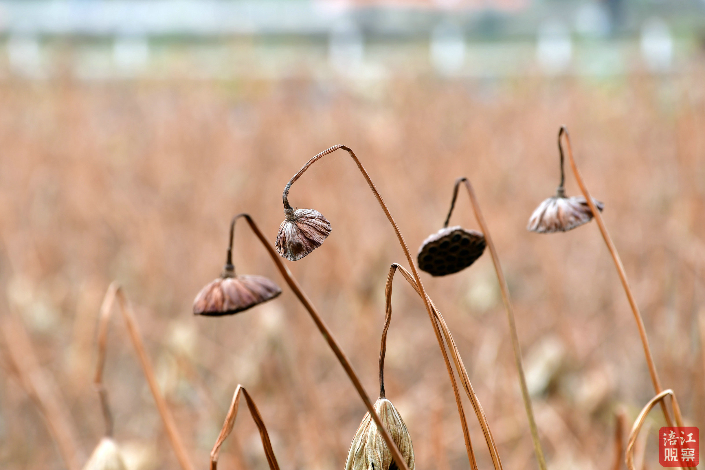 卷曲的荷葉與枯萎的蓮蓬,為深秋時節增添了幾分蕭瑟與恬靜。