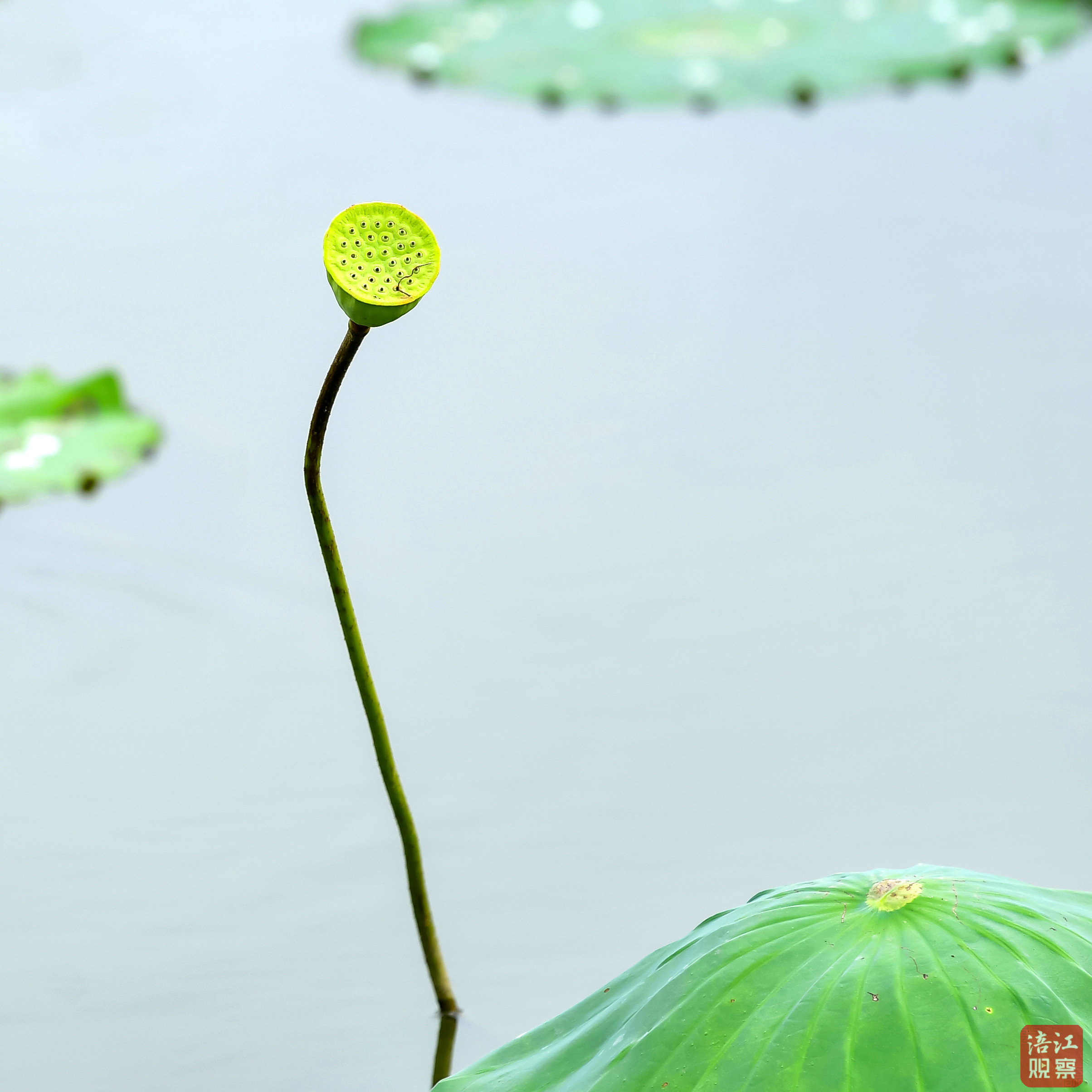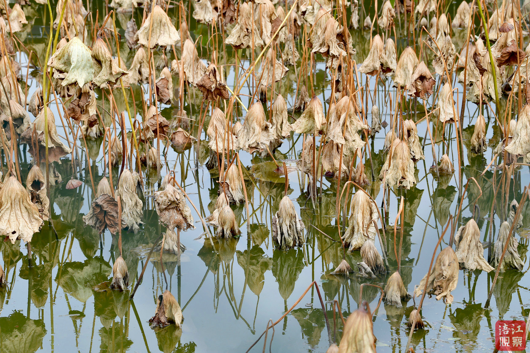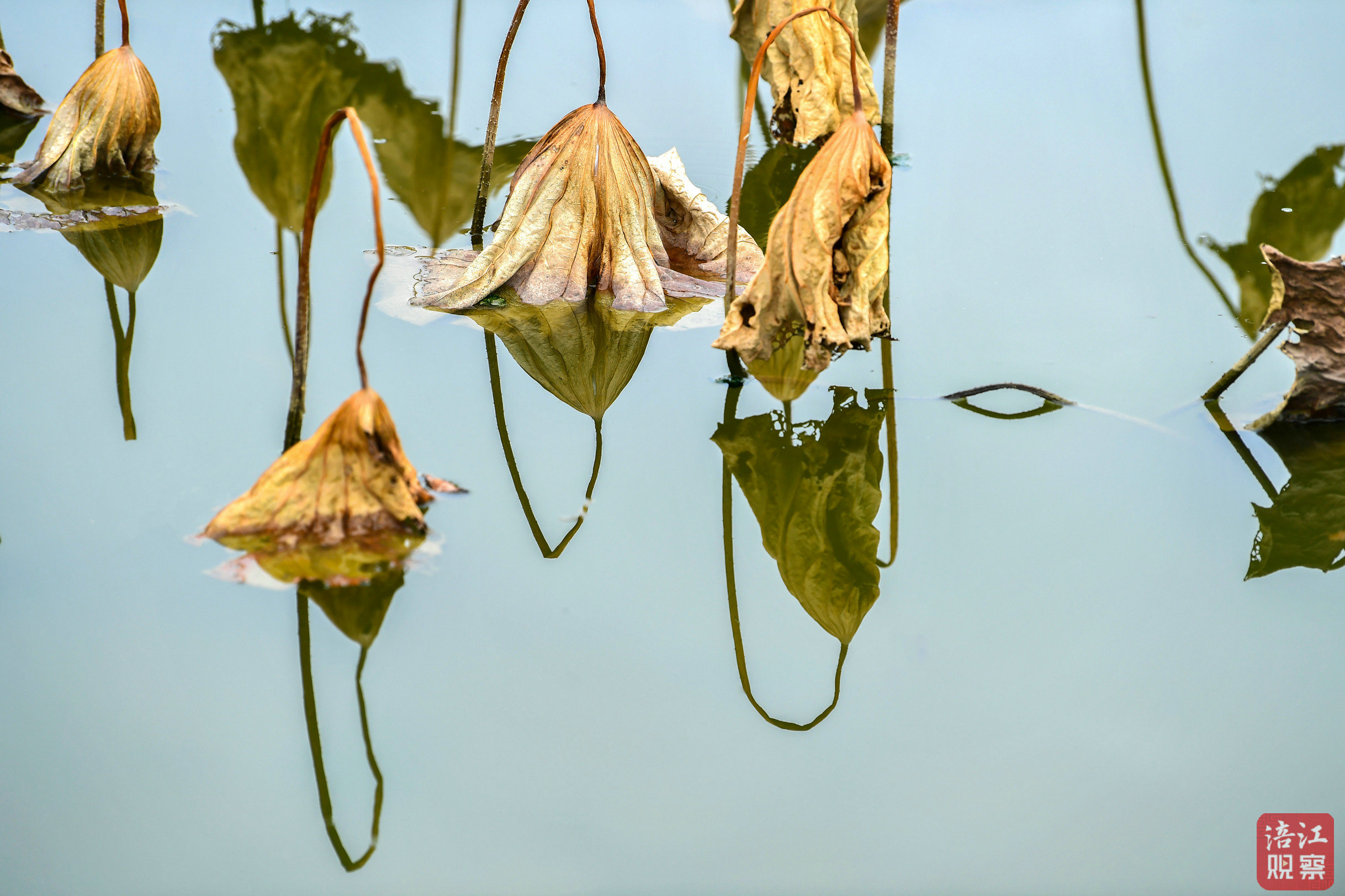 荷塘中,斜倚的莖稈倒映水面,宛如疏朗的線條,交織出簡潔的幾何之美。