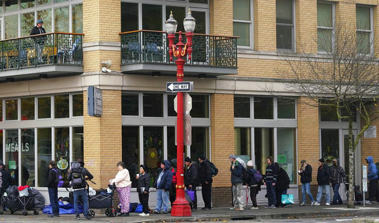 11月4日,在美國俄勒岡州波特蘭,等待領(lǐng)取免費(fèi)食物的人們在街頭排起長隊。新華社記者吳曉凌攝