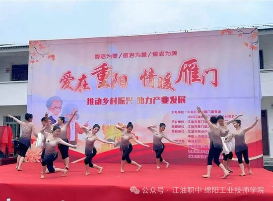 活動中,雁門關村民與江油職中師生同臺獻藝,16個節目依次上演。江油職中師生精心準備的兩個節目成為全場亮點——24級舞蹈班11名同學以精湛舞技演繹古典舞《寒依疏影》,展現傳統文化韻味;23級舞蹈班3名同學則以充滿活力的《風吟民族》傳遞民族風情。同學們用舞姿傳遞敬意,以青春感染銀齡,展現出職教學生不僅技能扎實,更懷揣社會責任與感恩之心。節目贏得了全場陣陣掌聲,場面溫馨動人。