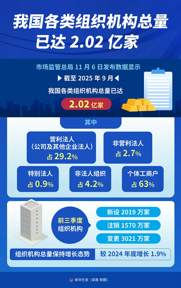 新華社北京11月6日電(記者趙文君)市場監管總局6日發布數據顯示,截至2025年9月,我國各類組織機構總量已達2.02億家。其中,營利法人(公司及其他企業法人)占29.2%;非營利法人占2.7%;特別法人占0.9%;非法人組織占4.2%;個體工商戶占63%。