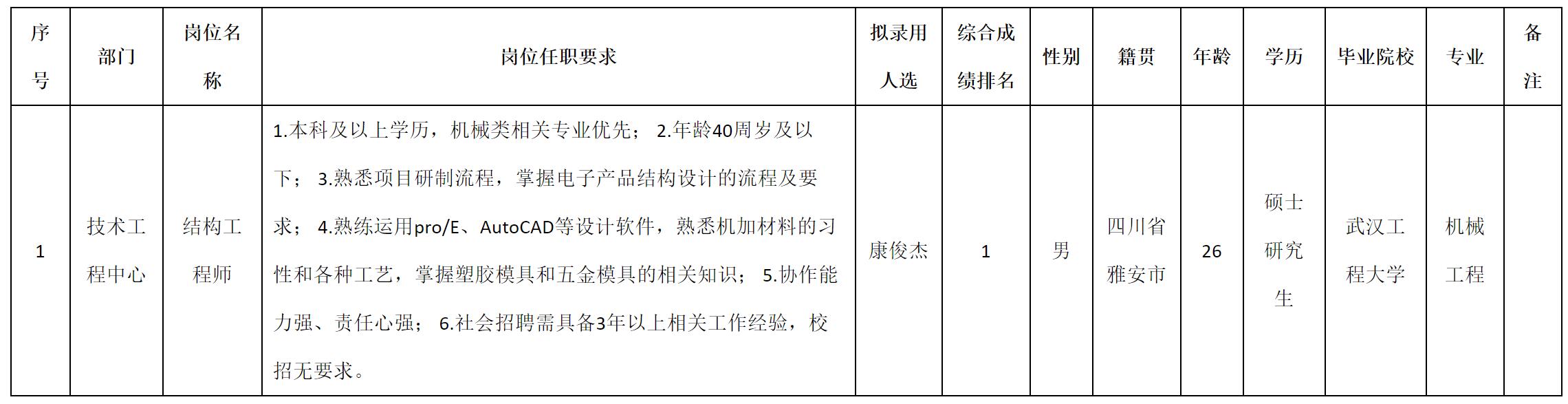 根據四川九洲光電科技股份有限公司發布的招聘公告及招聘相關規定,經測試、考察、體檢等程序,擬錄用康俊杰同志到四川九洲光電科技股份有限公司工作,現予以公示,具體情況如下: