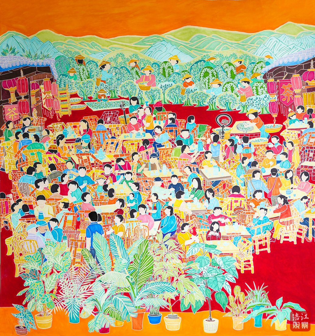 楊若雪的《茶香傳薪新·享茶品豐饒》構(gòu)圖以幾何化梯田、圓桌茶宴構(gòu)建秩序感,夸張變形的人物輪廓與茶樹(shù)形態(tài)釋放情感張力,形成“拙中藏巧”的視覺(jué)語(yǔ)言。作品畫(huà)面中,前幅呈現(xiàn)茶農(nóng)古法采茶、曬青、炒制,與網(wǎng)絡(luò)直播賣(mài)茶光影交織,傳統(tǒng)技藝與數(shù)字浪潮在茶香中對(duì)話;后幅游客圍坐茶宴,笑語(yǔ)隨茶湯漾開(kāi),品茗升華為鄉(xiāng)村美學(xué)儀式。作品以“薪火”續(xù)文化基因,以“豐饒”繪產(chǎn)業(yè)圖景,在鄉(xiāng)土煙火中熔鑄時(shí)代精神。觀者既見(jiàn)茶山律動(dòng),亦品振興史詩(shī)。