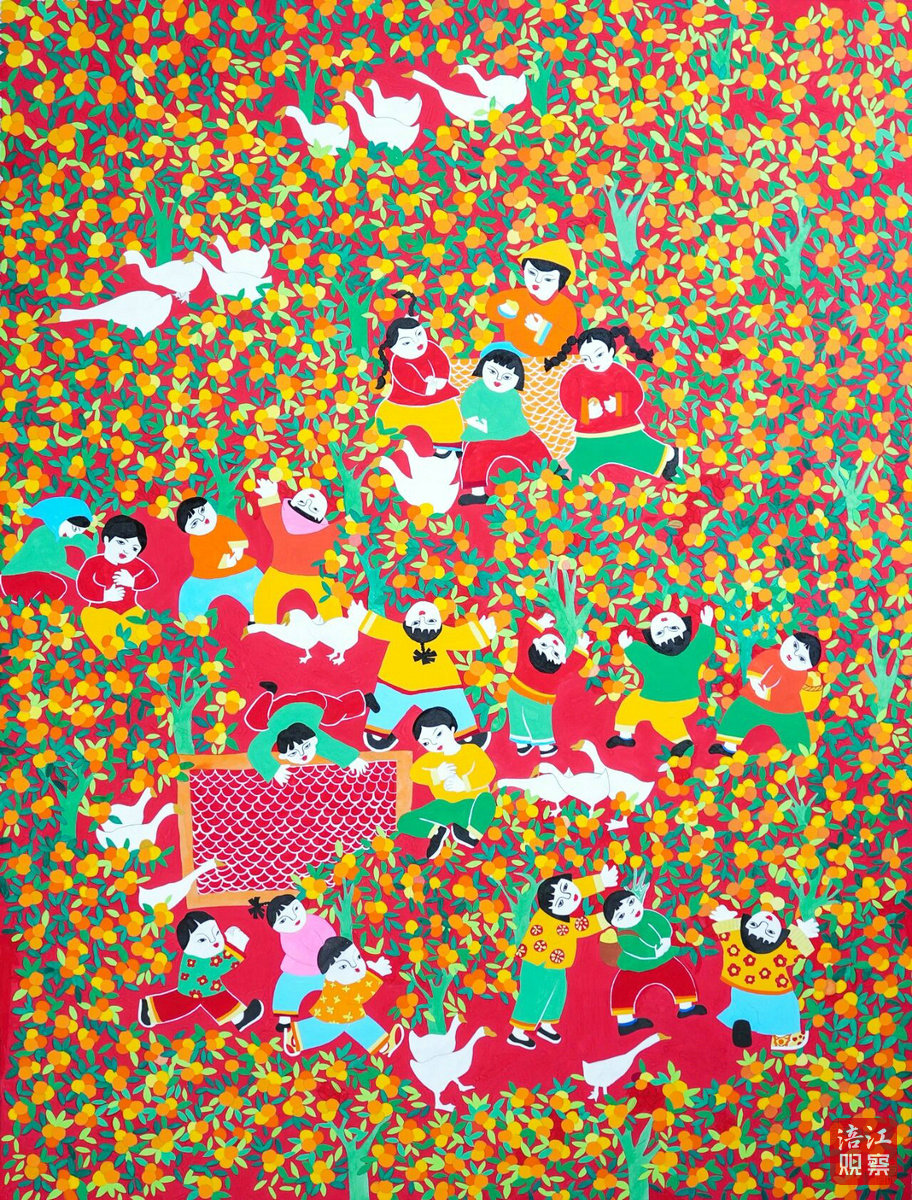 陳維兵的《幸福果農(nóng)》源于鄉(xiāng)村生活,描繪了勞動(dòng)情景和幸福生活的景象,通過(guò)夸張的造型和濃烈的色彩,生動(dòng)刻畫(huà)村民協(xié)作勞動(dòng)的場(chǎng)景。作品畫(huà)面風(fēng)格吉祥喜慶,表現(xiàn)了老百姓樂(lè)觀向上的生活追求和審美情趣。作品畫(huà)面色彩絢麗濃烈,裝飾平和自然,線條簡(jiǎn)練,凸顯農(nóng)民畫(huà)質(zhì)樸奔放的藝術(shù)特色,表現(xiàn)了老百姓對(duì)美好生活的向往以及對(duì)真善美的渴望與追求。