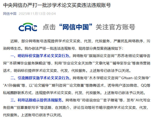 近期,部分網絡賬號違規提供學術論文買賣、代發、代投服務,嚴重擾亂網絡秩序,污染網絡生態。我辦依法嚴懲一批違法違規賬號,現將部分典型案例通報如下: