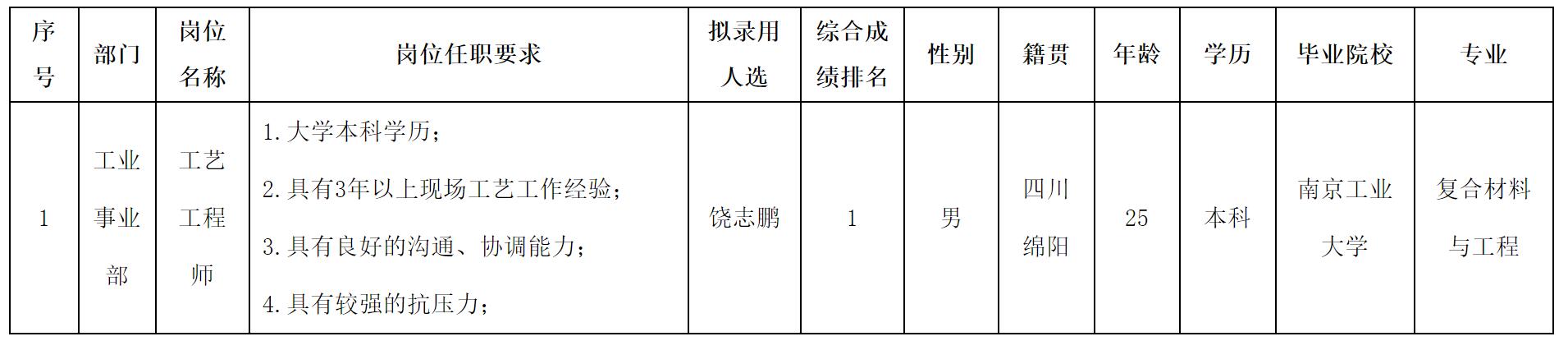 根據四川華豐科技股份有限公司發布的招聘公告及招聘相關規定,經測試等程序,擬錄用饒志鵬同志到四川華豐科技股份有限公司工作,現予以公示,具體情況如下: