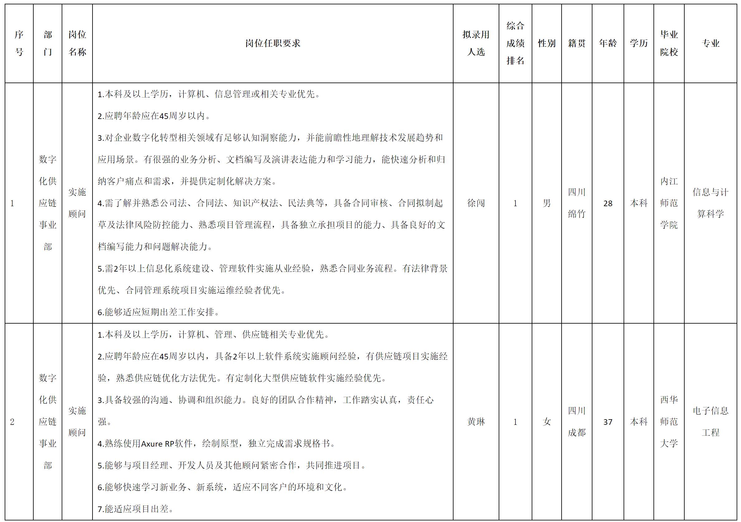 根據四川虹信軟件股份有限公司發布的招聘公告及招聘相關規定,經測試、考察、體檢等程序,擬錄用徐闖、黃琳同志到四川虹信軟件股份有限公司工作,現予以公示,具體情況如下: