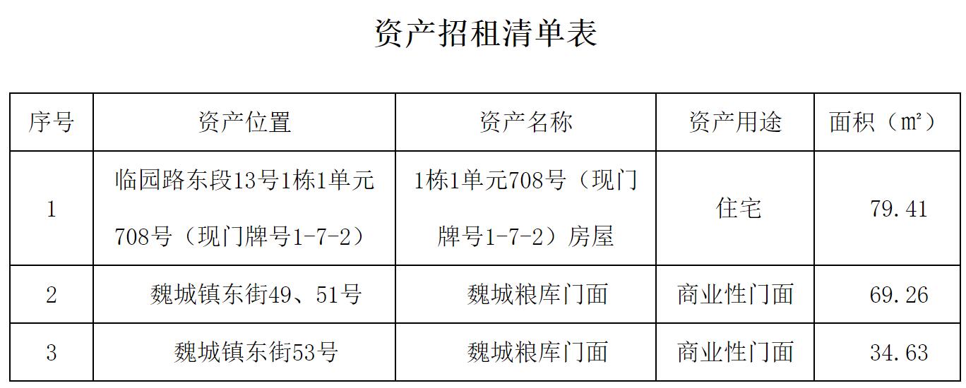 綿陽(yáng)市儲(chǔ)備糧管理有限公司現(xiàn)將權(quán)屬和代管的部分資產(chǎn)面向社會(huì)進(jìn)行公開(kāi)競(jìng)價(jià)招租(詳見(jiàn)《資產(chǎn)招租清單表》),有關(guān)事宜公告如下: