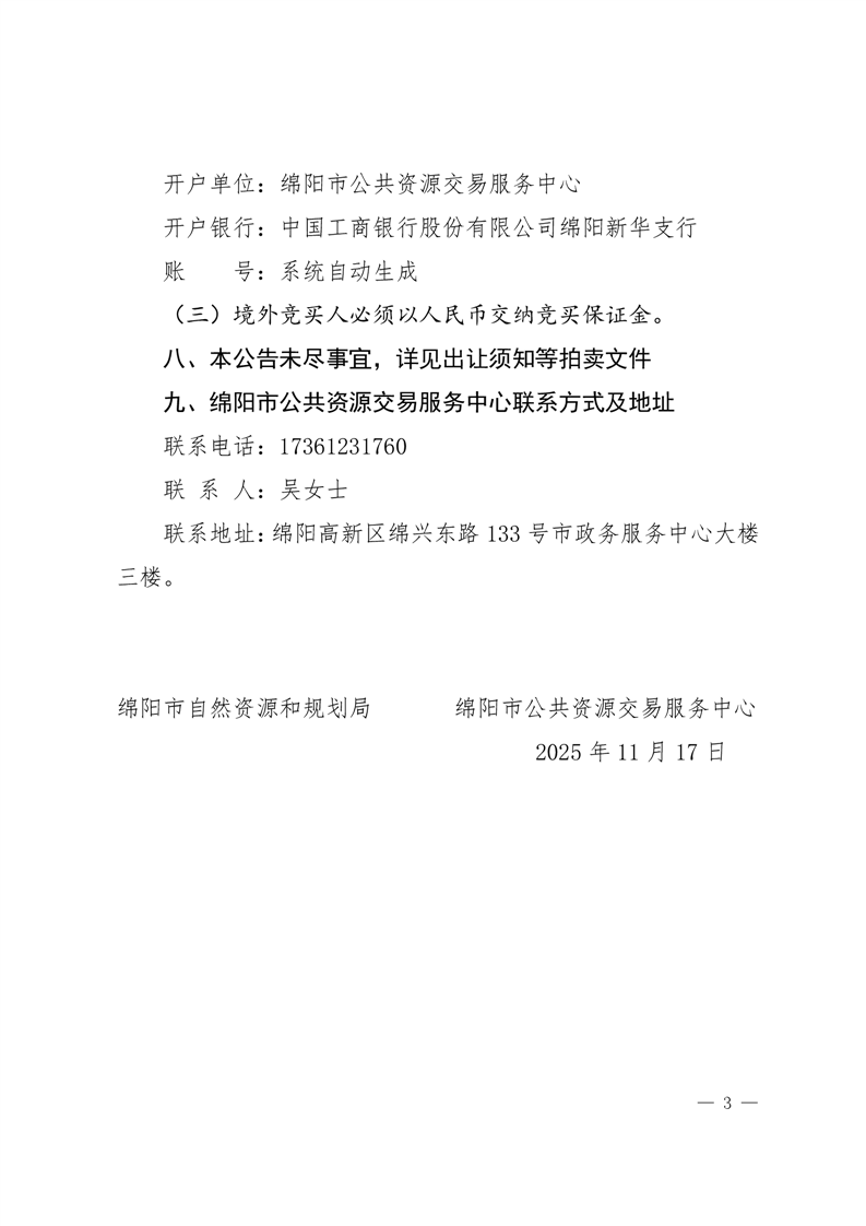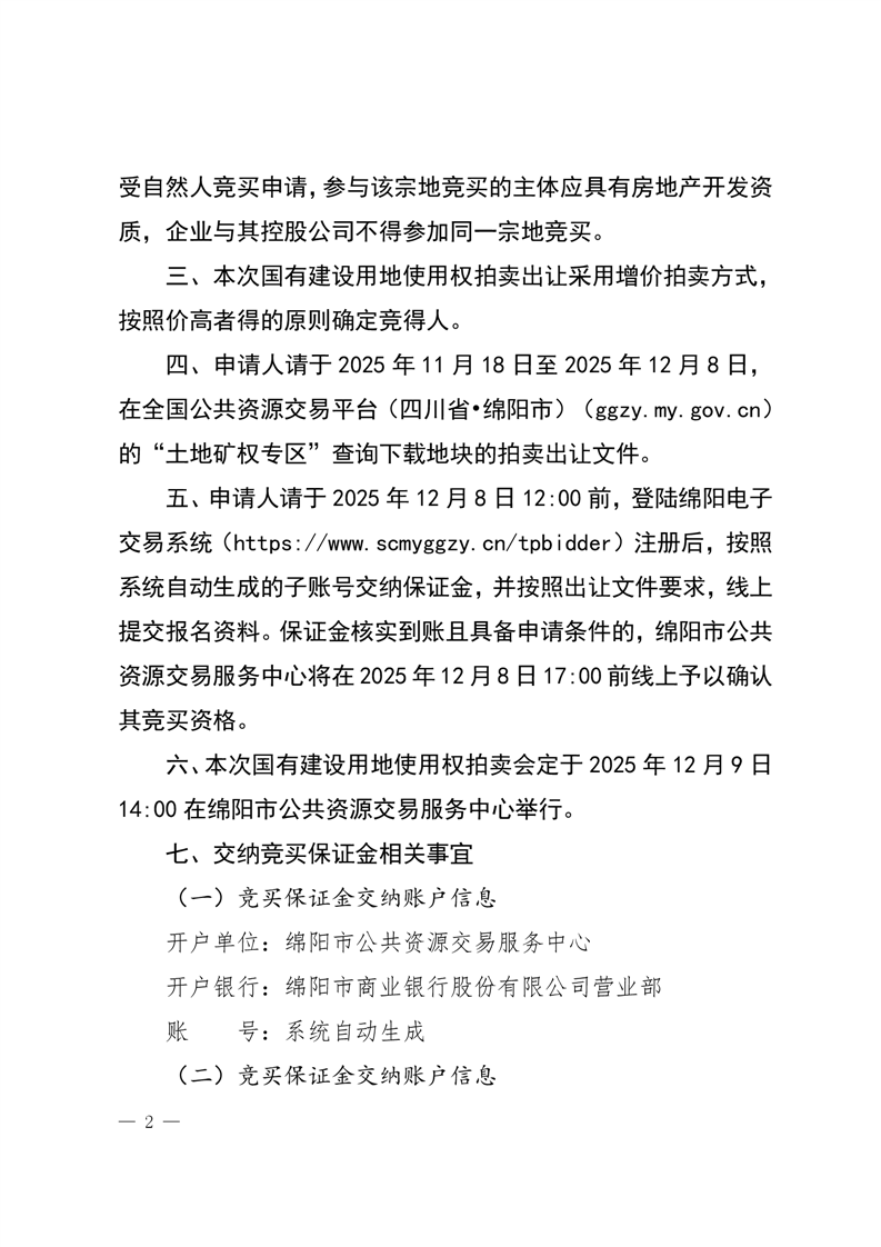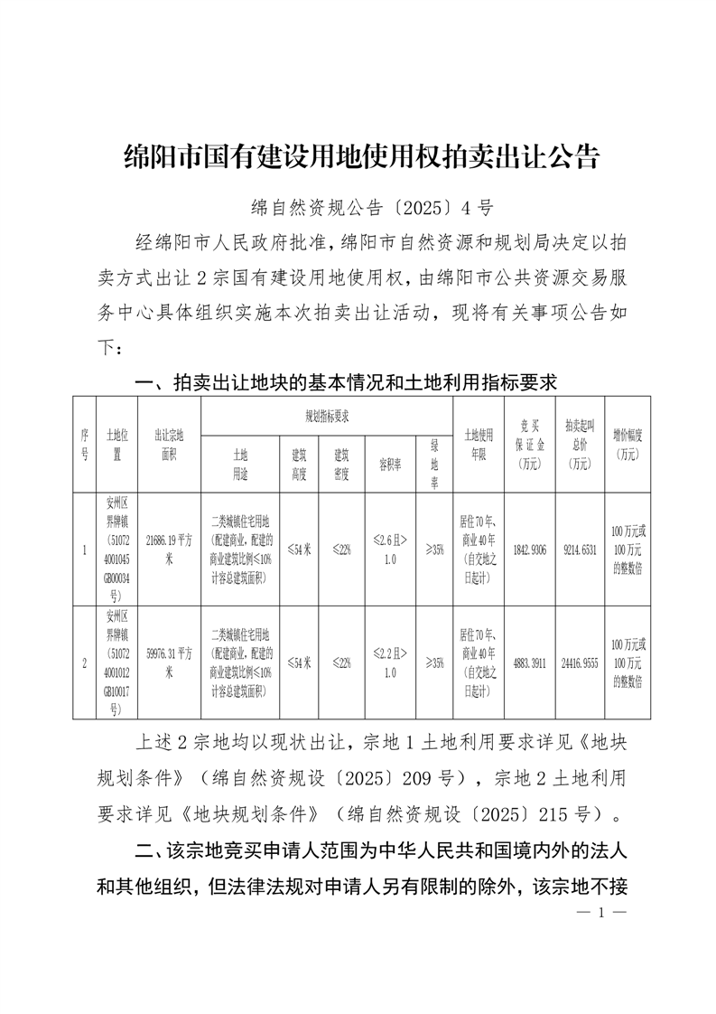 綿陽市國有建設用地使用權拍賣出讓公告(綿自然資規公告〔2025〕4號)
