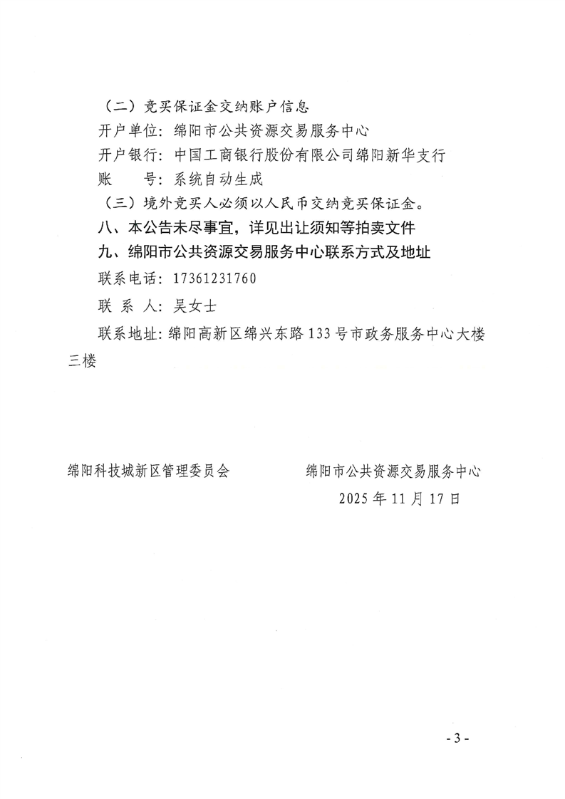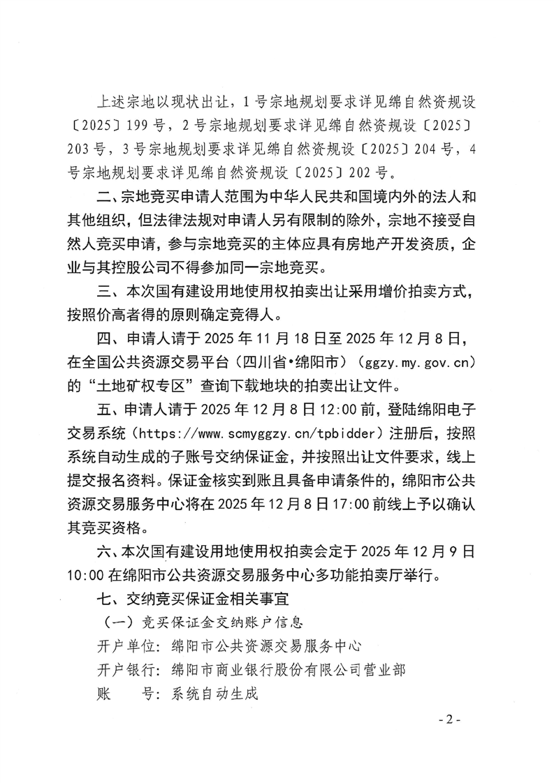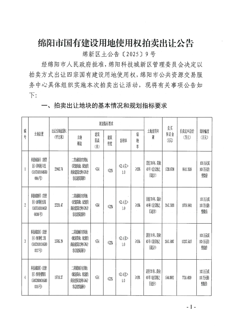 綿陽市國有建設用地使用權拍賣出讓公告(綿新區土公告〔2025〕9號)
