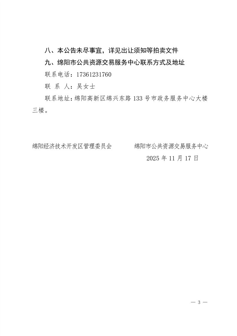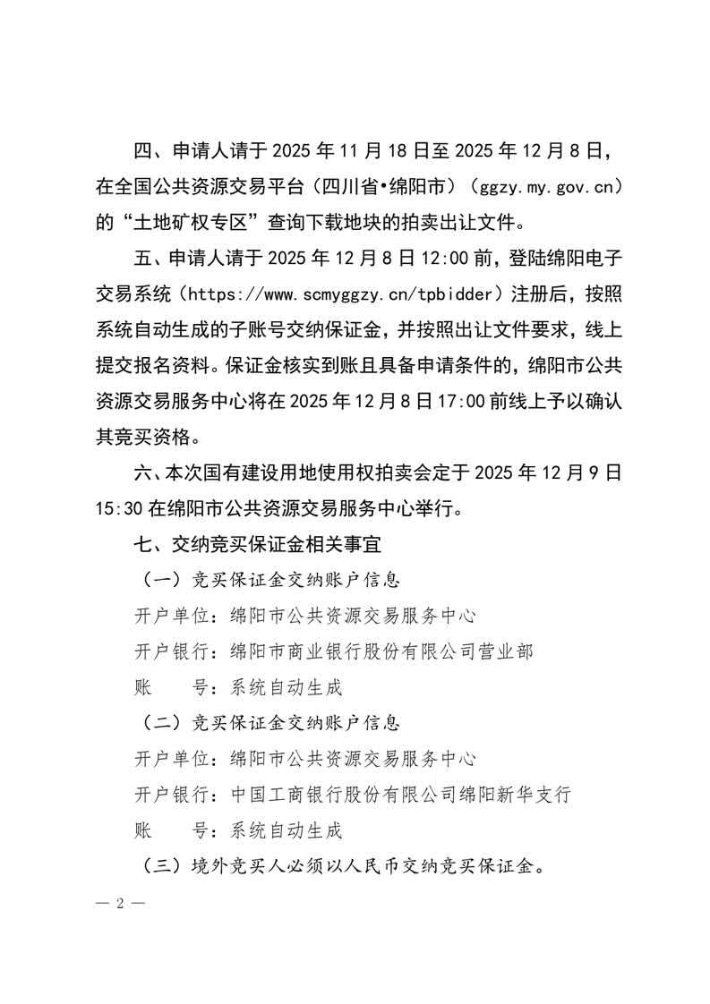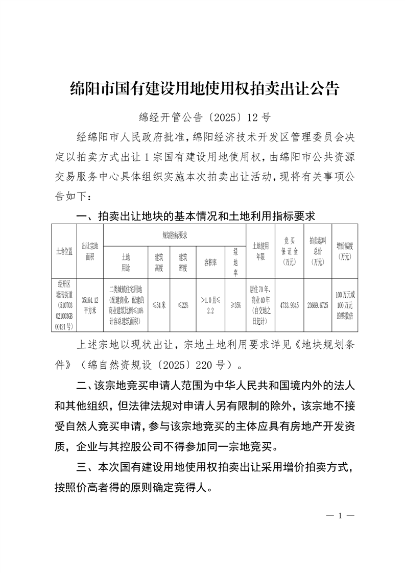 綿陽市國有建設用地使用權拍賣出讓公告(綿經開管公告〔2025〕12號)