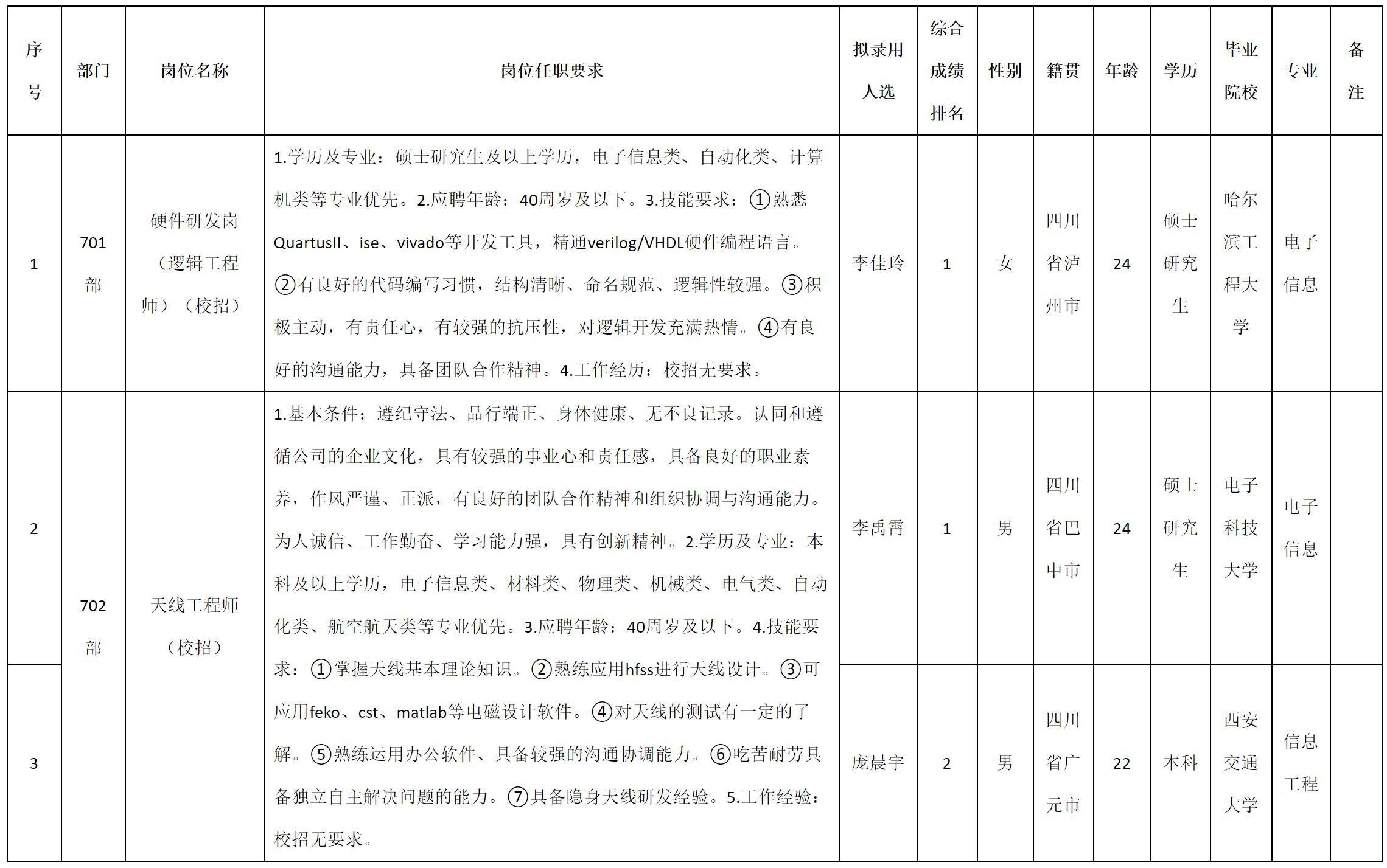 根據四川九洲電器集團有限責任公司發布的招聘公告及招聘相關規定,經測試、考察、體檢等程序,擬錄用李佳玲等3名同志到四川九洲電器集團有限責任公司工作,現予以公示,具體情況如下:
