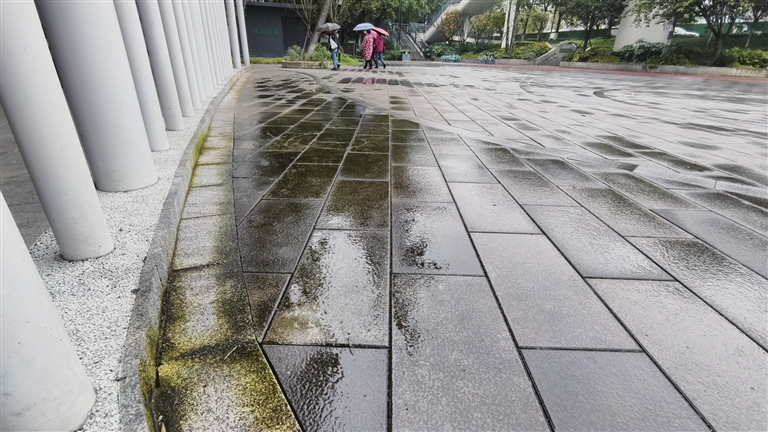 近日,一場雨后,記者實地探訪發現,該處廣場廊架下的地磚表面附著明顯青苔,雨水浸潤后更顯濕滑,多位市民向記者反映:“幾乎每天都有人在這里摔倒。”