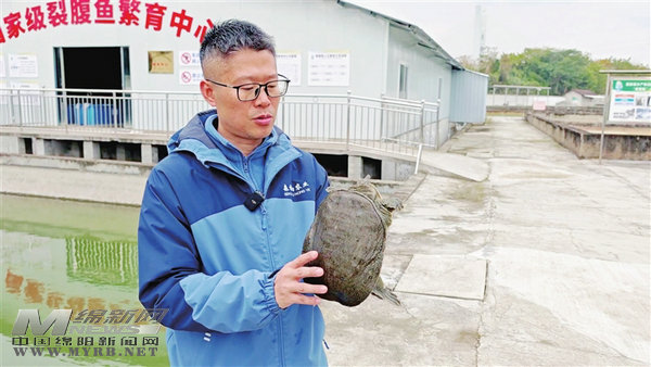 甲魚養殖基地負責人陳彬展示甲魚新品種“圌山1號”。 記者 陳元松 攝