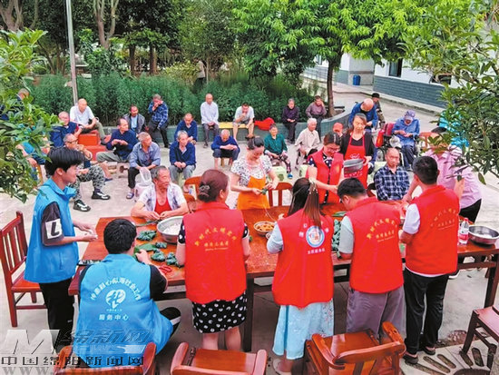 梓潼縣瑪瑙鎮志愿者為敬老院老人送餐包粽子。記者 劉曉東 攝