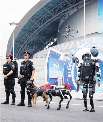 第十三屆科博會(huì),安保警力協(xié)同警用機(jī)器狗、人形機(jī)器人等智能裝備“上崗執(zhí)勤”。視覺(jué)綿陽(yáng)資料圖片