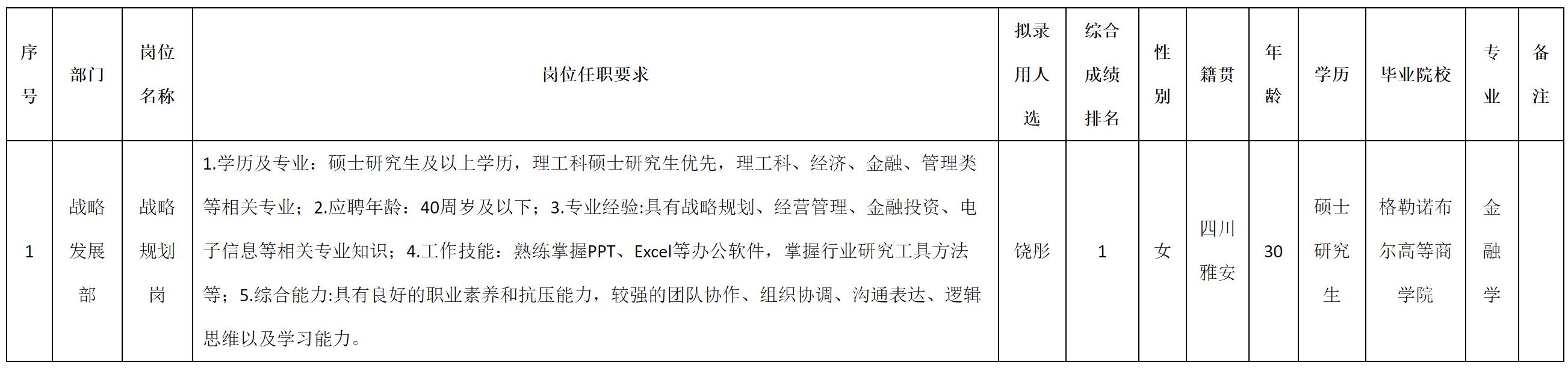 根據四川九洲投資控股集團有限公司發(fā)布的招聘公告及招聘相關規(guī)定,經測試、考察、體檢等程序,擬錄用饒彤同志到四川九洲投資控股集團有限公司工作,現予以公示,具體情況如下: