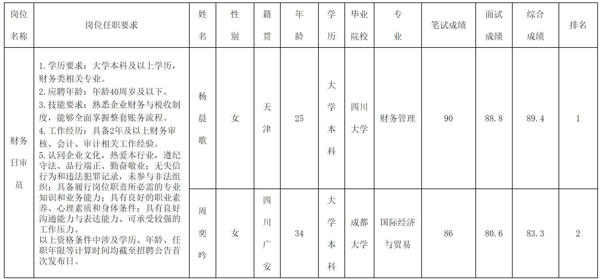 根據綿陽富樂山九洲國際酒店有限公司關于財務日審員招聘公告及招聘相關規定,經筆試、面試等程序,現將招聘成績予以公示。