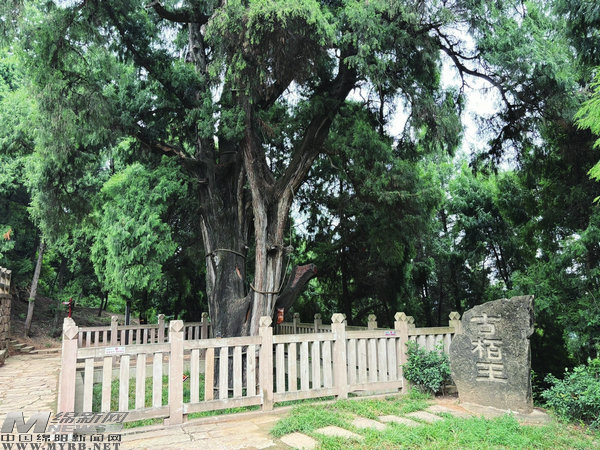 在游仙區忠興鎮佛祖寺,“荊山雙柏”拔地而起,高達22米,枝繁葉茂,胸徑近兩米,需三五人伸臂合圍。這棵奇特的柏樹由一棵樹一分為二生長而成,宛如連體孿生。據傳,它是在乾隆四十八年(1783年),由寺廟住持如參所植。尤為少見的是,這棵樹既載入民國十八年(1929年)的《荊山滴米寺雙柏記》,又載入清代綿州名儒汪廣猷的《荊山滴米寺雙柏記》,一棵樹有兩通碑刻載記,承載著厚重的歷史文化信息。