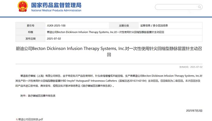7月2日,國家藥品監(jiān)督管理局發(fā)布通告,碧迪醫(yī)療器械(上海)有限公司報告,生產(chǎn)商碧迪公司Becton Dickinson Infusion Therapy Systems, Inc.對其生產(chǎn)的一次性使用針尖回縮型靜脈留置針BD Insyte™ Autoguard™ Intravenous Catheters(國械注進(jìn)20163142184)主動召回。召回級別為二級召回。