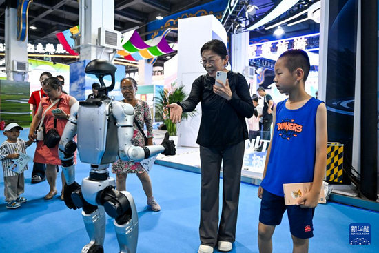 7月17日,觀眾在第九屆內蒙古自治區文化產業博覽交易會現場與機器人互動。