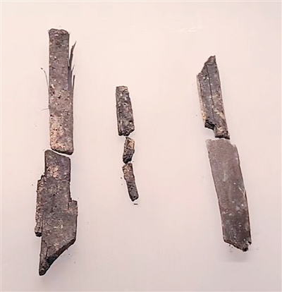 展柜里的碳化竹片出土于寶墩古城一處紅燒土基址中,是竹骨泥墻式居住建筑的構件。圖文展板和視頻展示了此類建筑的修筑過程:先在平地挖基槽,然后在基槽內插入竹子,再將泥土與木屑混合攪拌,均勻涂抹在竹子表面,最后在墻體周圍堆放薪材,點火烘烤,加固墻體。
