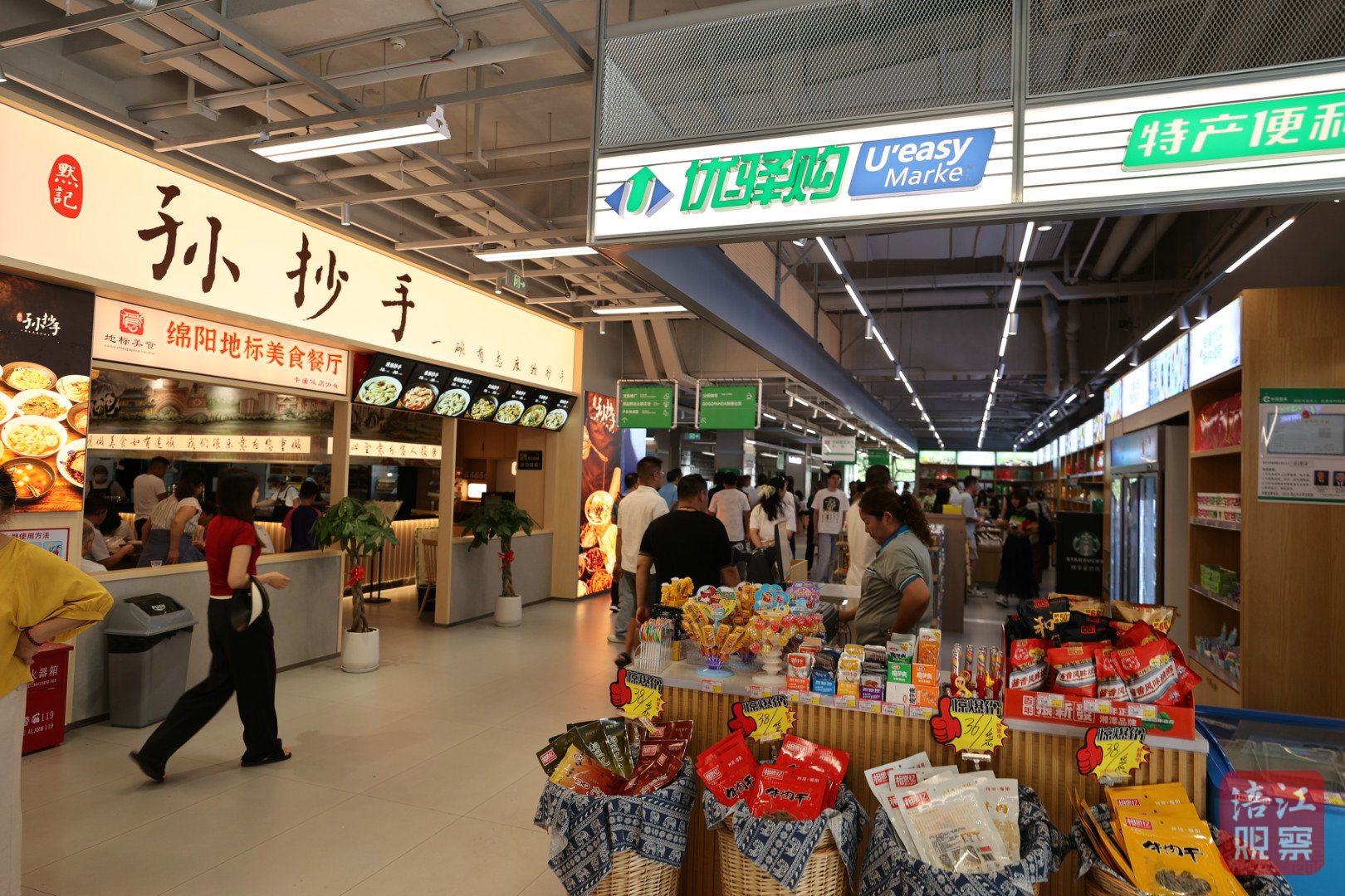 走進服務區(qū),現(xiàn)場人氣爆棚,熱鬧非凡。名優(yōu)特展銷區(qū)里人頭攢動,平武天麻、臘肉等地方特產(chǎn)琳瑯滿目,不少旅客駐足選購,有的拿起臘肉湊近聞聞香味,有的和攤主討價還價,還有的已經(jīng)提著大包小包的特產(chǎn)滿意離去。孩子們則被熊貓造型的雕塑吸引,圍著雕塑跑來跑去,發(fā)出陣陣歡笑聲。