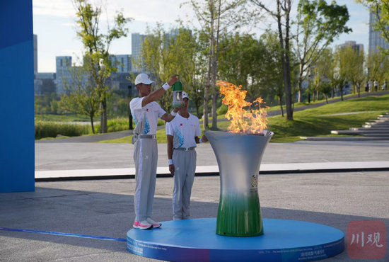 7月26日下午,成都世運會火炬傳遞在興隆湖畔完成“收火”。